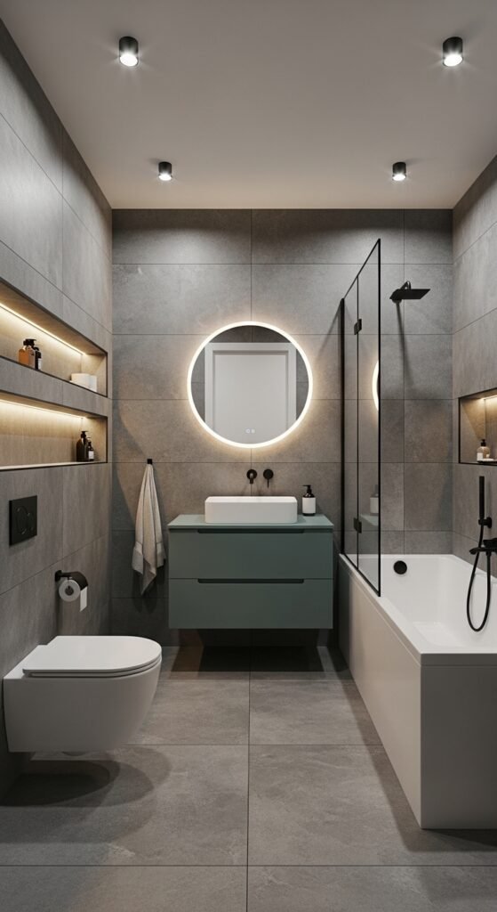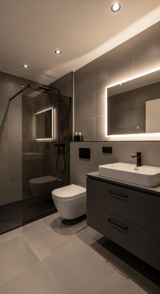 The “Illuminated Elegance” comes from integrated lighting features. We are talking about backlit mirrors, under-vanity lighting that makes the cabinet appear to float, and recessed lighting in shower niches. These hidden light sources wash the grey walls with a soft glow, highlighting the sleekness of the surfaces. It creates a futuristic, high-end hotel vibe that is incredibly impressive. The monochrome palette ensures that the lighting remains the star, with no clashing colors to distract the eye.