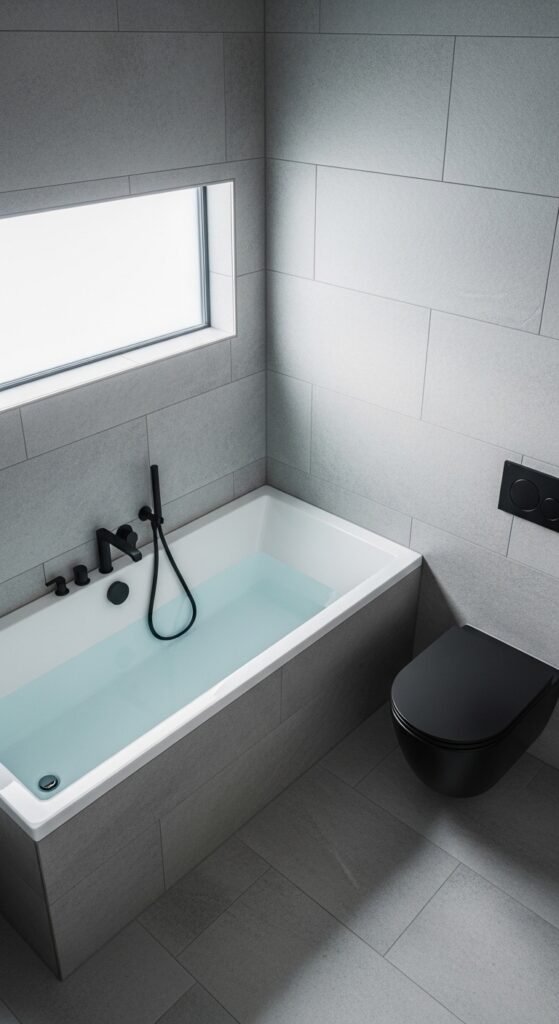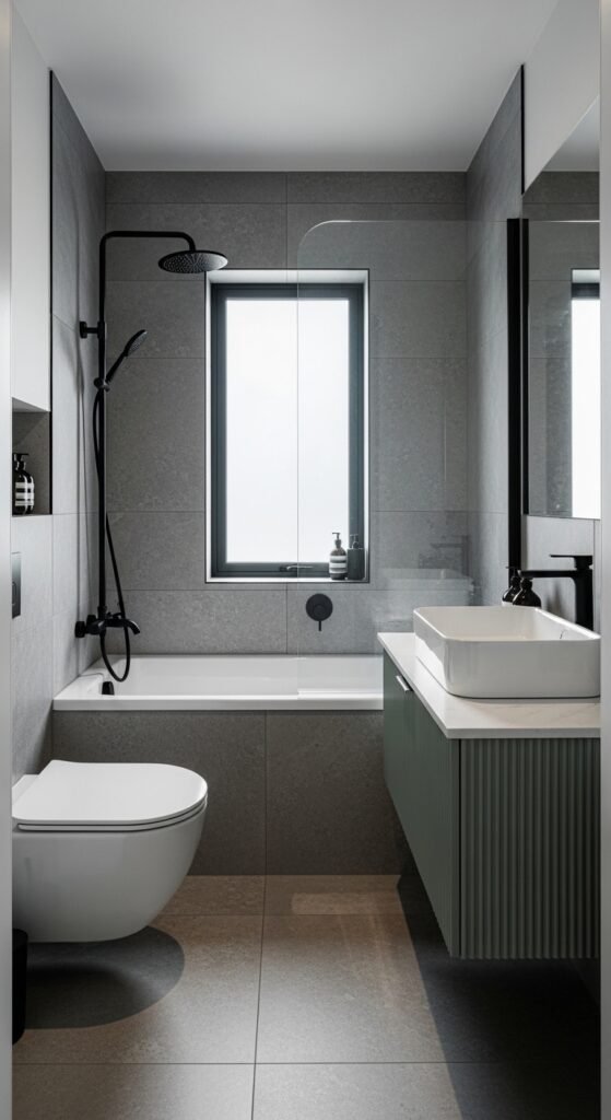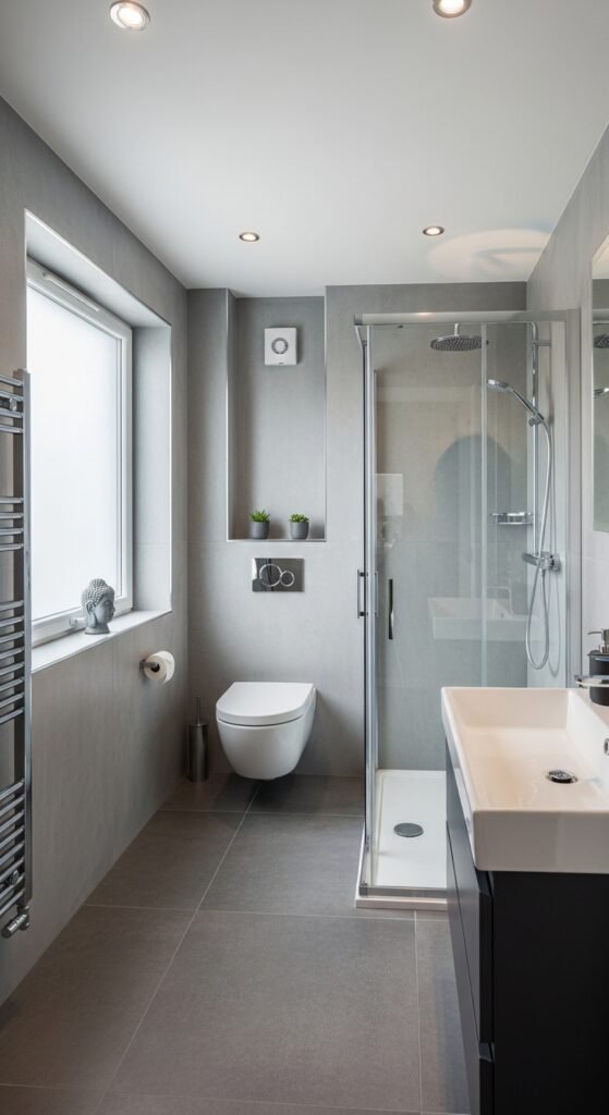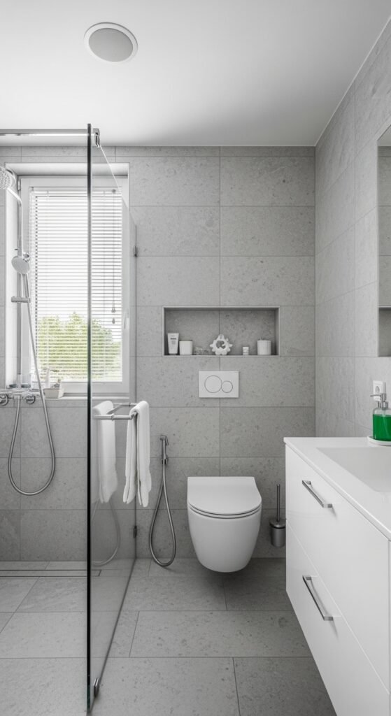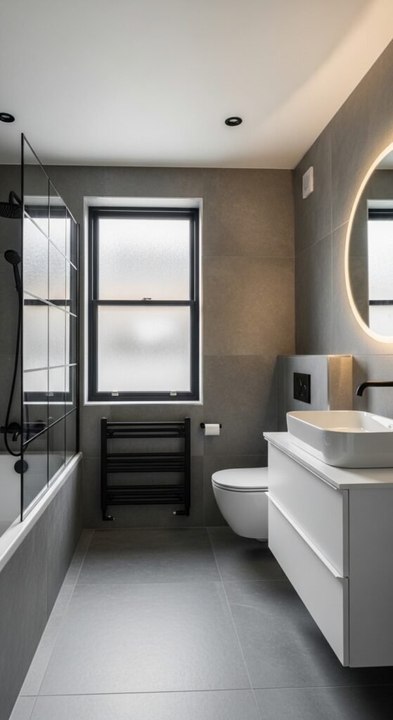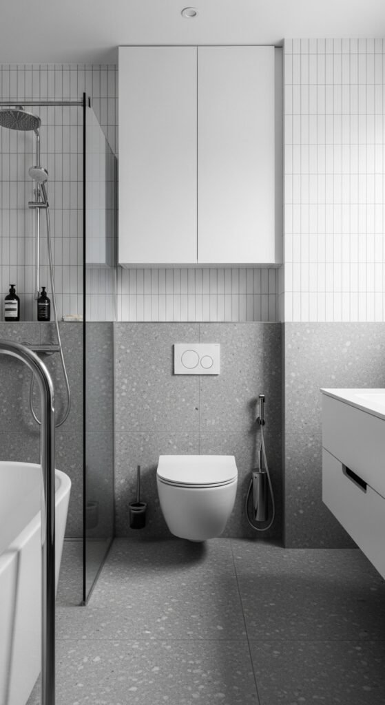 A “Harmonized Haven” relies on the 60-30-10 rule of color, but applies it using only shades of grey. 60% of the room is a mid-tone grey (walls/floor), 30% is a lighter grey (ceiling/sanitary ware), and 10% is a dark charcoal accent (window frames/towels). This creates a balanced, harmonious look that feels “right” to the human eye.