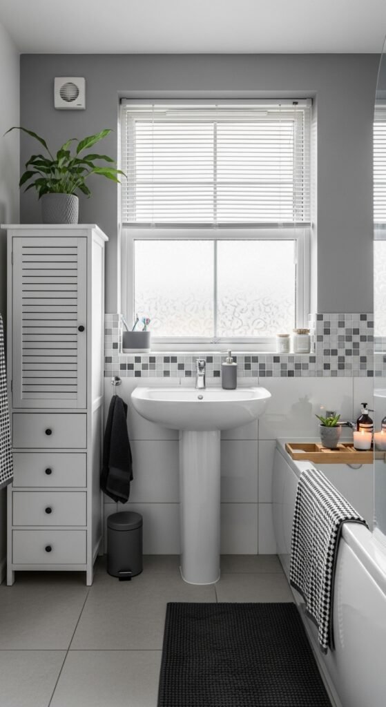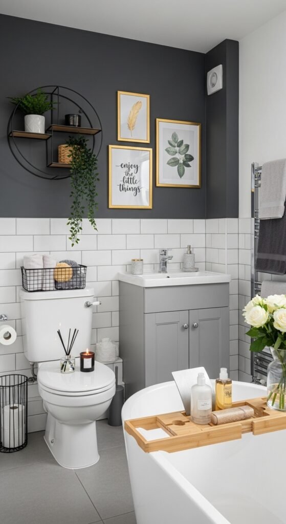 The “Modern Monochrome” base ensures that despite the eclectic additions, the room remains cohesive. It feels curated and expensive. This is a great way to inject personality into a rental where you cannot change the grey tiles. By layering “elevated” decor items, you draw the eye away from the fixtures and towards the design narrative you have created.