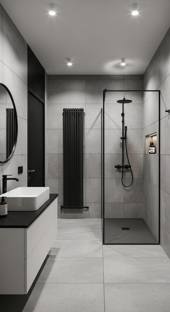“Midnight Oasis” is the epitome of city living—sleek, somewhat masculine, and undeniably cool. This style embraces the darker, industrial side of grey. We are looking at concrete finishes, exposed piping, or “gunmetal” grey fixtures. It reflects the urban landscape outside, bringing the grit and glamour of the city skyline indoors. The walls might feature a micro-cement finish, which offers a seamless, joint-free look that is very popular in high-end lofts.