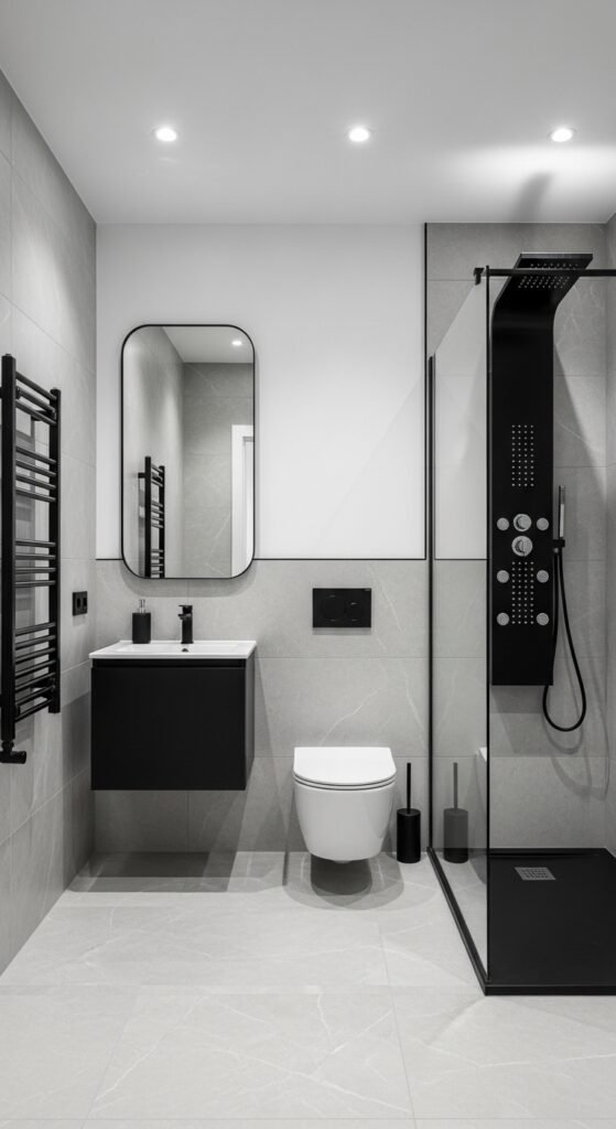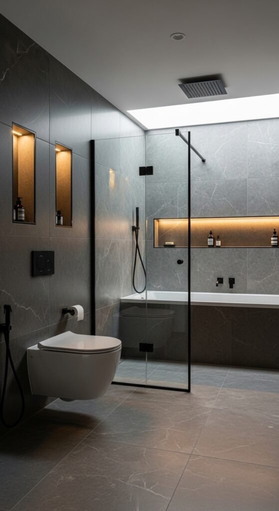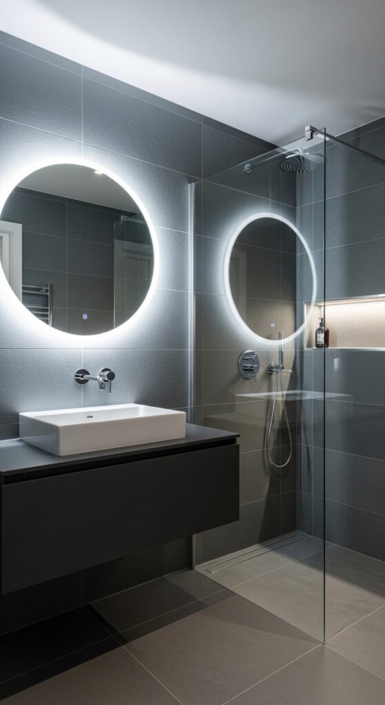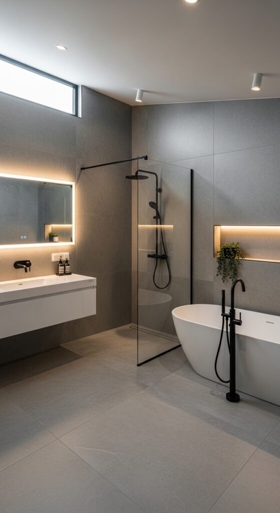This iteration of “Sleek Serenity” focuses on the intersection of technology and design. Modern elegance in 2026 involves smart bathroom features integrated seamlessly into a grey aesthetic. We are seeing digital shower controls with sleek black interfaces that disappear into dark grey tiles, and smart mirrors that display the time and weather.