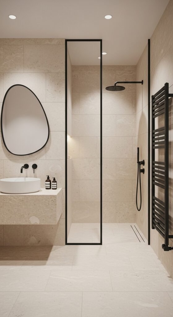 “Sculpted Serenity” introduces architectural interest into the bathroom. This could be in the form of a structural column clad in grey stone, a built-in bench in the shower, or a custom-molded concrete vanity sink. The grey material is treated as a solid mass that has been carved out to create the space.