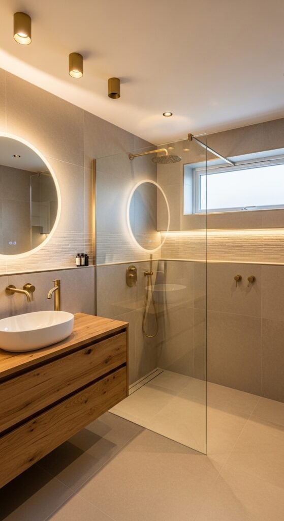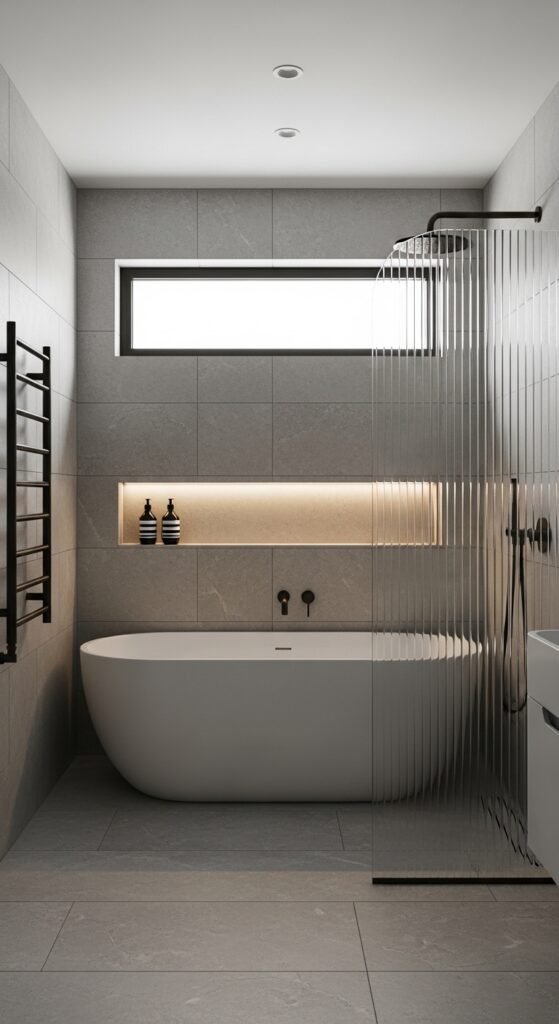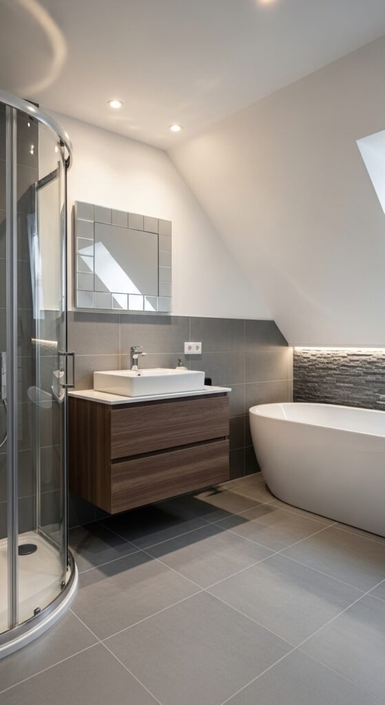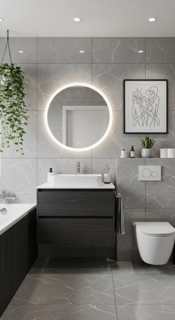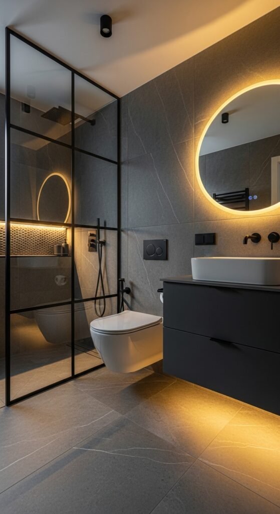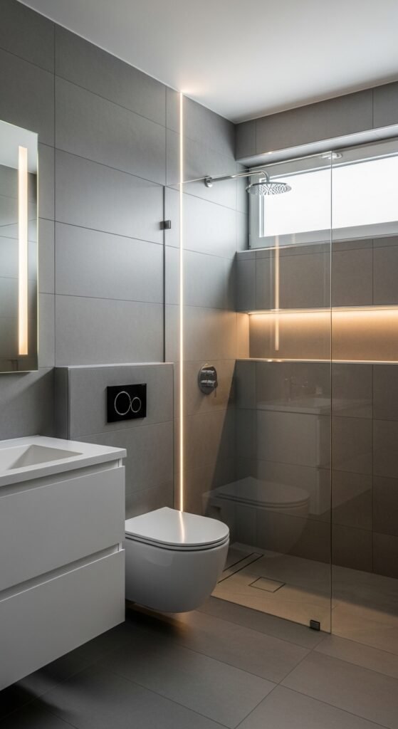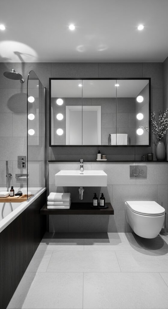 Lighting is often an afterthought in bathroom design, but in the “Sleek Serenity” concept, it is the main event. This design uses grey as a medium to manipulate light. High-gloss grey tiles or large-format polished porcelain are used to reflect light, creating a shimmering, water-like effect. This is particularly effective in windowless bathrooms where maximizing artificial light is necessary. The grey surfaces act as a mirror, bouncing light into dark corners and making the room feel bright and clean.