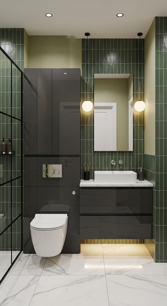 You can introduce this color through a painted vanity unit, emerald green subway tiles in the shower niche, or even just luxurious velvet styling touches if you are renting. The contrast between the industrial, “gritty” grey and the opulent, smooth green is striking. Gold or brass hardware is the perfect third element here; it warms up the grey and complements the regal nature of the emerald green perfectly.