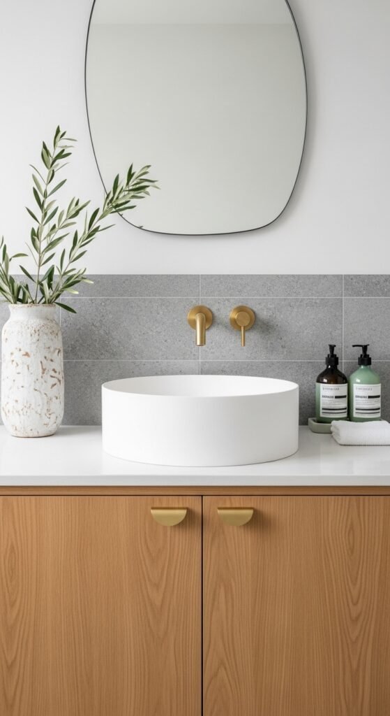 This style blends the warmth of beige with the cool of grey, often called “greige.” It is the ultimate neutral. The walls might be a very pale warm grey, paired with natural wood elements like a teak stool or an oak vanity. The wood tones cut through the grey and add organic warmth.