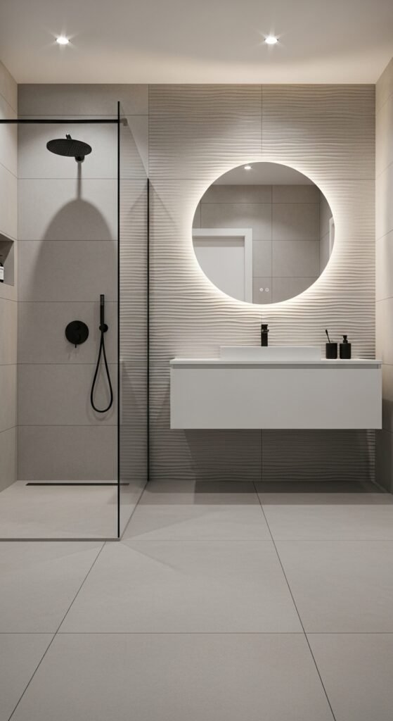 Hard lines can make a grey bathroom feel clinical. This design counters that by introducing curves. Round mirrors, oval soaking tubs, and curved faucet necks break up the boxy nature of standard bathrooms. The grey element here comes from textured wall tiles that mimic natural stone or slate.