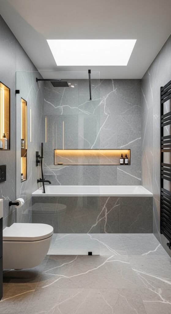 “Urban Sanctuary” meets luxury in this marble-heavy design. Grey marble, such as Carrara or Statuario with heavy grey veining, is the star. It is used on floors and walls to create a wrap-around effect that feels incredibly expensive. The “Minimalism” comes in to balance the busy pattern of the marble. Simple glass screens and floating white vanities ensure the marble remains the focal point.