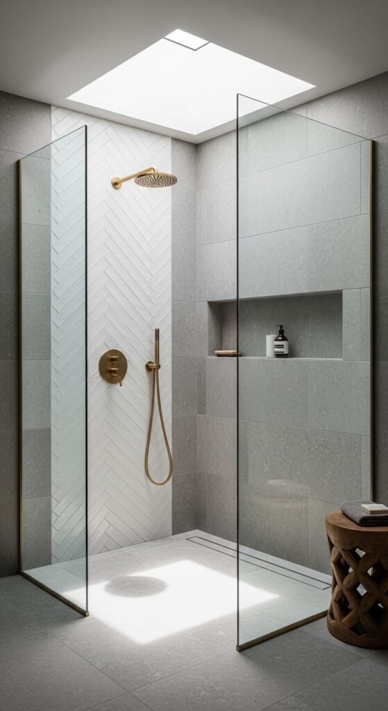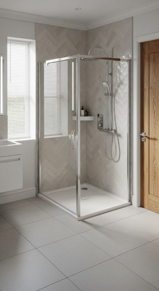 This specific look focuses on the shower area as the jewel of the bathroom. “Herringbone Dreams” refers to the tiling pattern—rectangular grey tiles laid in a V-shape. This pattern points the eye upwards, making the ceiling feel higher. It adds a sophisticated, tailored look to the walls.