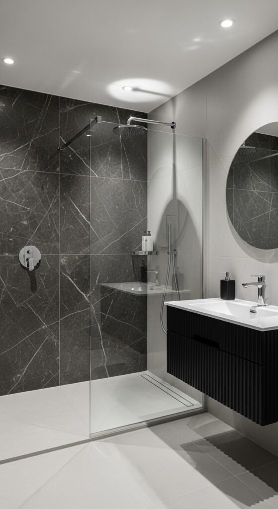 Natural stone is the star here. Large slabs of grey marble, travertine, or limestone cover the walls. The veining in the stone provides natural art. No two tiles are alike. This organic pattern is far more interesting than a painted wall.